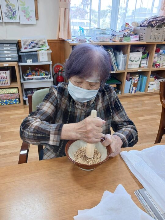 デイサービスにて、先日、天日干し🌞していた稲を、利用者の方々に籾摺りしてもらっています😝