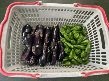 中庭の畑のお野菜です。美味しそうなナス🍆が出来てました~🤗畑担当職員が暑い中も頑張って💪育てたお野菜です!